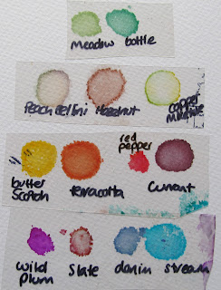 For each of my distress inks I have a cut out a sizzix tag. Each ink is blended on the tag using a blending tool and foam, I then stamp an image on the tag using the same colour and then ink directly around the tag again in the same colour. I then write the colour of the ink used on the front of the tag. Each tag is then put on a bookring with coordinating colours placed together. This gives me a quick and simple way to view what the colours look like blended and applied directly.